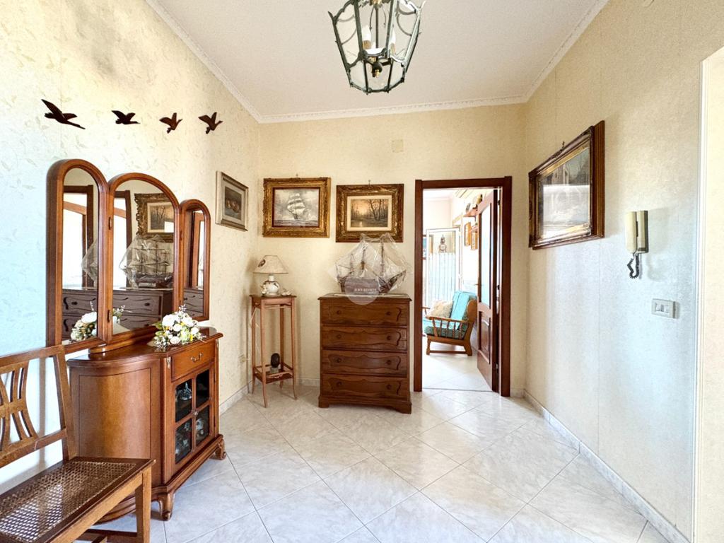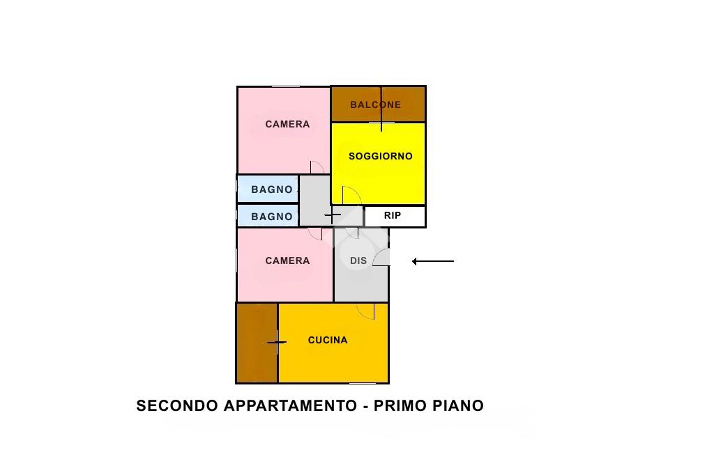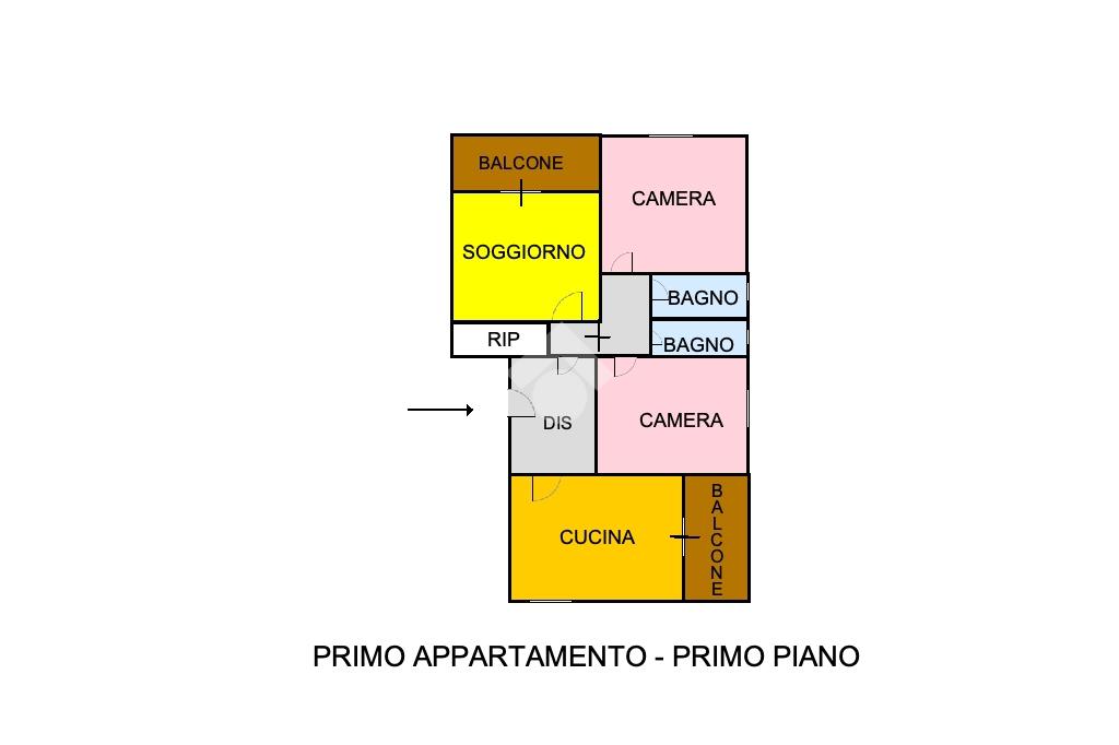 Al primo piano ci sono due appartamenti, con un metratura di 105 mq, perfettamente uguali, cosi composti: il portoncino d'ingresso si apre su un disimpegno che ci conduce alla cucina abitabile, al salone e al ripostiglio; la zona notte dal corridoio da accesso alle due camere da letto e ai due bagni, di cui uno con vasca e l'altro con doccia. Gli immobili sono molto luminosi e dispingono di due balconi.